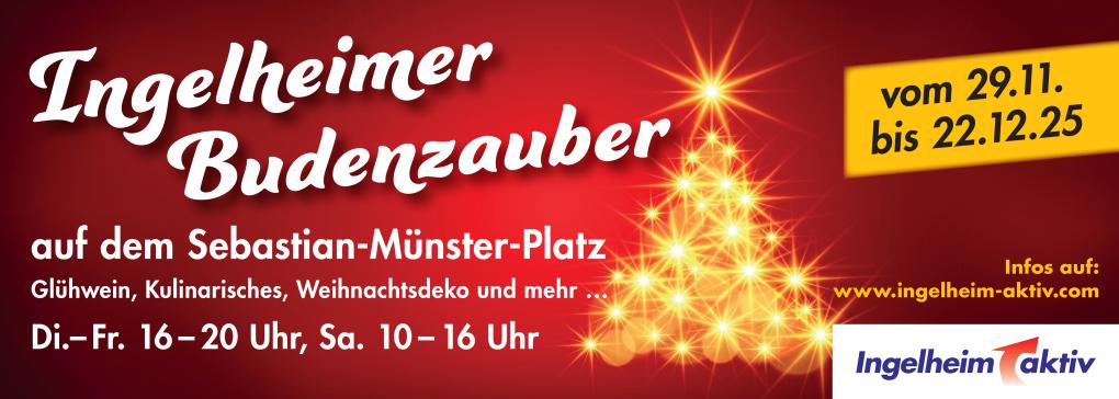 Ab dem 29. November wird der Ingelheimer Budenzauber die Ingelheimer Innenstadt für gute 4 Wochen verzaubern. Neben dem traditionellen Weihnachtsbaum und der weihnachtlichen Beleuchtung der Stadt Ingelheim werden auf dem Sebastian-Münster-Platz in festlichen Buden Glühwein und Leckeres angeboten werden und bis zum 22.12. ein Treffpunkt für Freunde, Vereine und Firmen sein. Organisiert wird der Ingelheimer Budenzauber von dem Gewerbeverein Ingelheim aktiv, der die Gäste anregen möchte, in der vorweihnachtlichen Zeit die Innenstadt zu besuchen und dort bei einem Glühwein mit Freunden zu verweilen.